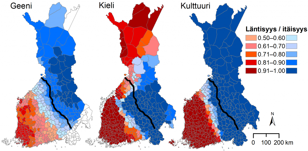Historialliset pitäjät jakautuvat geenien, kielen ja kulttuurin perusteella itäisiin ja läntisiin. Parhaiten ilmiöidenjakautuminen noudattelee katolisen Ruotsin ja ortodoksisen Novgorodin vaikutuspiirin rajaa 1200-luvulta.Mitä tummempi sininen, sitä enemmän itäisyyttä, ja mitä tummempi punainen, sitä enemmän läntisyyttä. Kuvassa näkyy lisäksi Pähkinäsaaren rauhan rajan sijainti mustalla.
